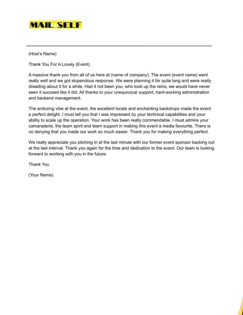 - A thank you letter is an excellent way to express your sentiment. The letter should talk about the importance of the host in your life. Mention what makes your bond special. You can also recollect memorable moments at the event.