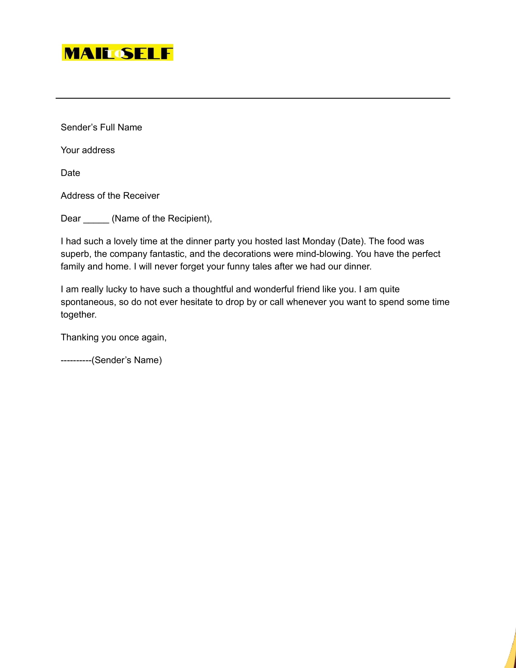 I had such a lovely time at the dinner party you hosted last Monday (Date). The food was superb, the company fantastic, and the decorations were mind-blowing. You have the perfect family and home. I will never forget your funny tales after we had our dinner.